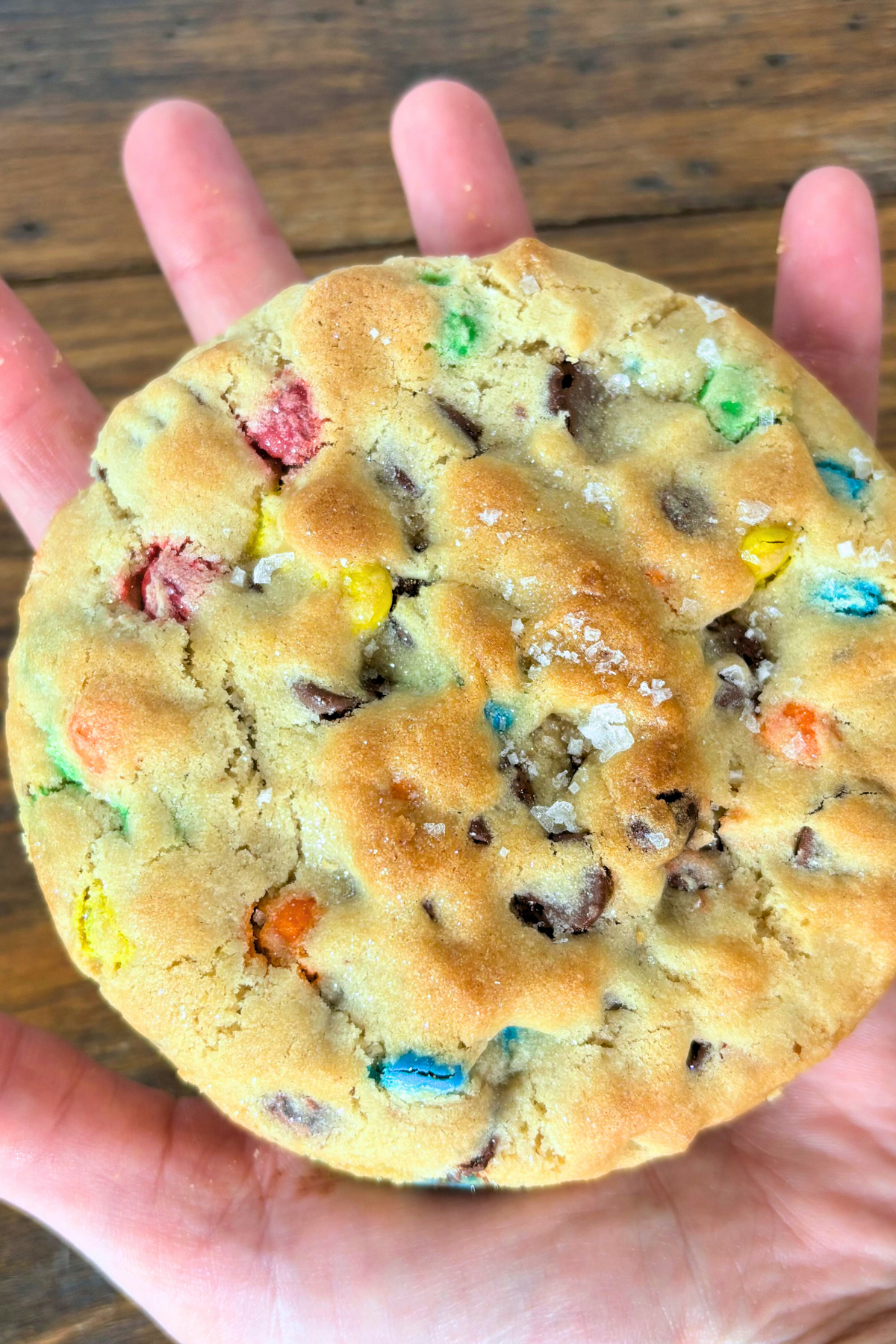 6 giant cookies made with real butter, premium chocolate and King Arthur flour. Each cookie is mixed, rolled and weighed by hand, and baked in small batches. The cookies are nearly ½ pound and are meant to be savored like a dessert, not a snack. We individually wrap them. Cookies can be frozen for months, thawed and enjoyed.